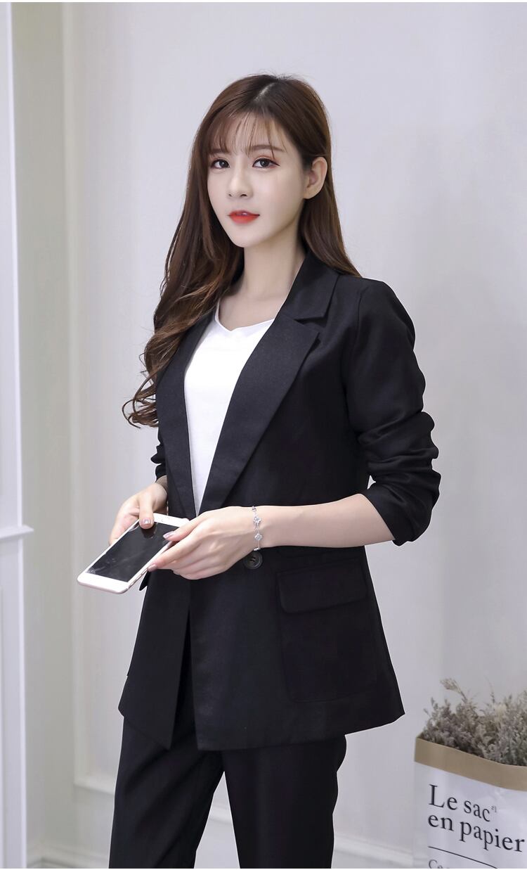 シンプルなジャケットとクロップド丈パンツのセットアップスーツ。
