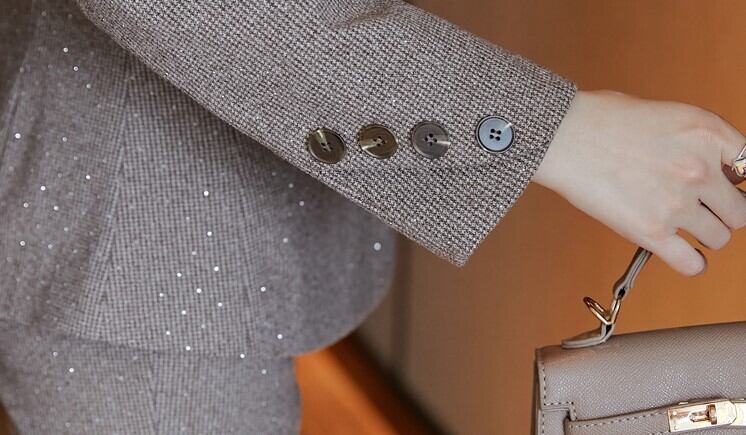 ウエストシェイプされフェミニンなラインのジャケットと、ボトムスのフレアが細く長く見せてくれるボトムスのセットアップ。