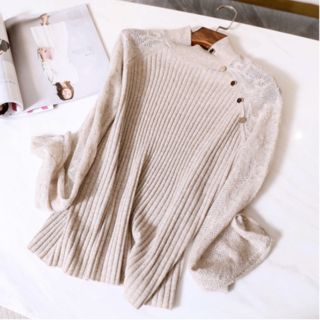 ニット生地とレース袖が可愛い、大人の女性らしい一枚です。