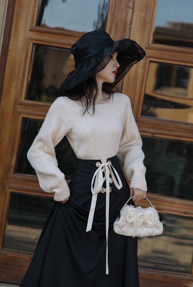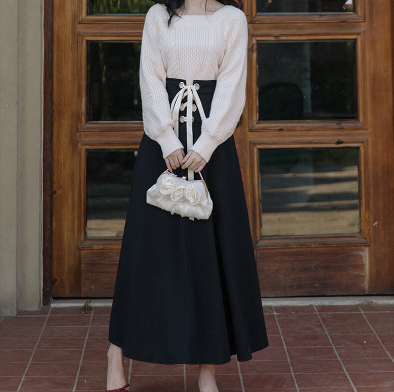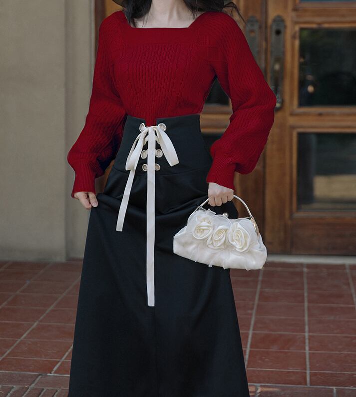 トップス スカート ニットソー セーター ロングスカート フレアスカート ロング ロング丈 マキシ マキシ丈 袖あり 長袖 スクエアネック フレア スリム タイト 細身 Aライン リボン ウエストリボン ニット 上下セット 2点セット かわいい 大人可愛い きれいめ 大人 上品 おしゃれ お洒落 かっこいい 無地 秋 冬 10代 20代 30代 レディース デート お出かけ 女子会 休日 着回し 普段使い 韓国 韓国系 オルチャン ファッション コーデ スタイル 楽ちん モテ 定番 プチプラ トレンド | Ritta