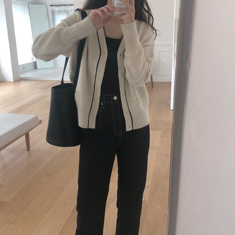 バイカラーVネックニットカーディガン。