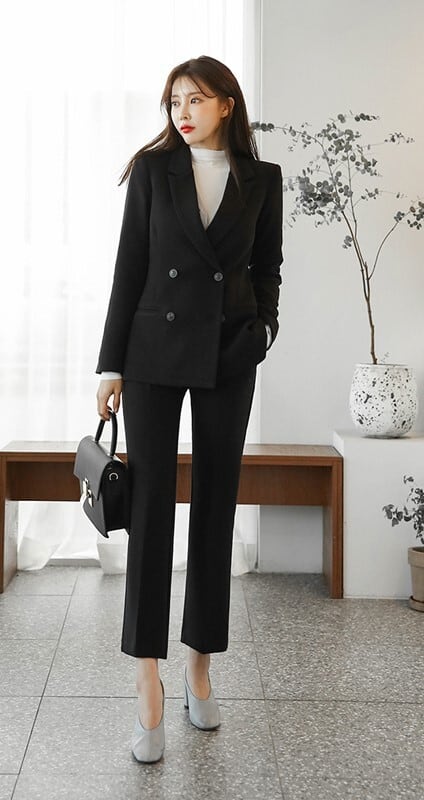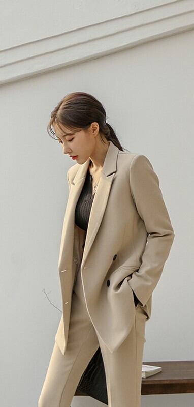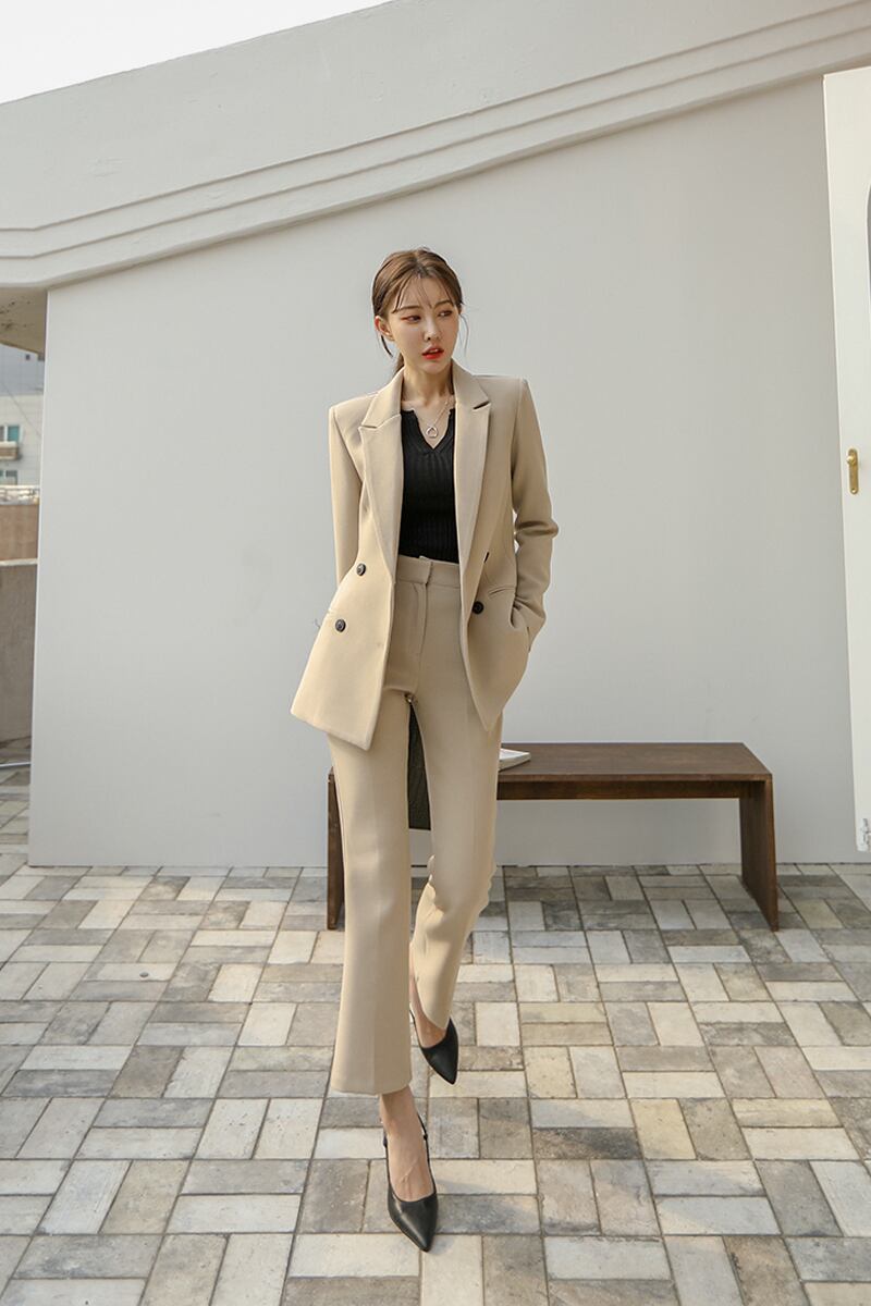 ダブルのジャケットとクロップド丈のパンツのセットアップ。