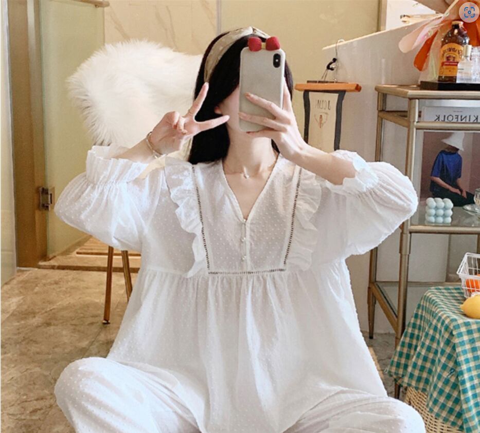 コットンレース生地のツーピースルームウェア。