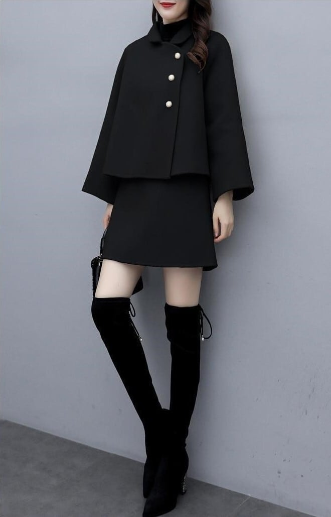 一見ボレロのような、Aラインの裾の広がりが可愛らしいジャケットと、同じAラインのミニスカートのセットアップ。