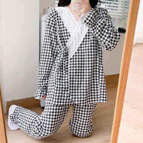 千鳥格子×レースルームウェア パジャマ 部屋着 寝巻き ナイトウェア ロング丈 袖あり 長袖 Vネック カシュクール ワイド レース ウエストゴム 伸縮性 綿 上下セット 2点セット ツーピース かわいい 大人可愛い きれいめ シンプル カジュアル 大人 おしゃれ お洒落 かっこいい レトロ 大人女子 こなれ感 エレガント 存在感 千鳥格子 春 夏 秋 20代 30代 40代 レディース 女性用 ママ マタニティ お泊まり 普段使い 体型カバー 3XL 4XL 5XL 大きめ ゆったり 黒 ブラック | Ritta