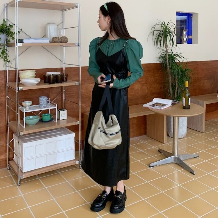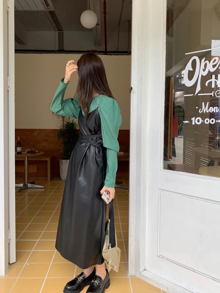 レザーのハードさとウエストのリボンのギャップが可愛いキャミワンピース。
