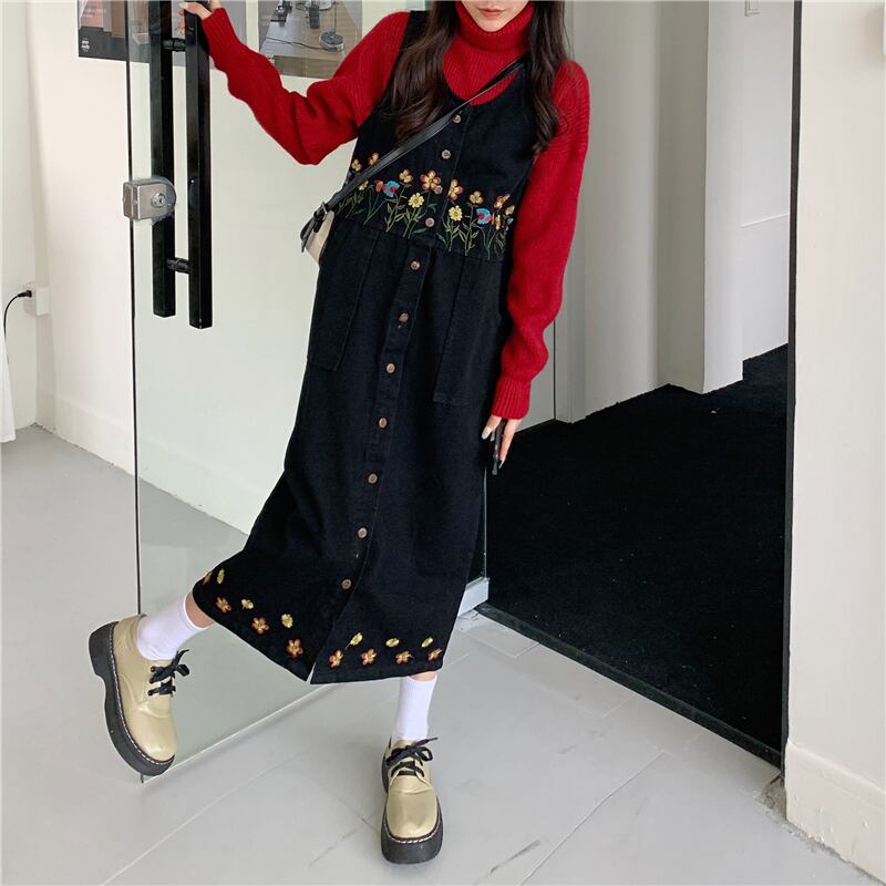ワンピース ジャンパースカート ジャンスカ デニムワンピース 膝下 ミモレ丈 ミディアム丈 袖なし ラウンドネック 襟なし ストレート ワイド Iライン 刺繍 ウエストマーク 前開き 綿 デニム かわいい 大人可愛い シンプル カジュアル おしゃれ レトロ 大人女子 こなれ感 ラフ ラブリー キュート ガーリー 無地 花柄 春 秋 冬 10代 20代 学生 通学 デート お出かけ 着回し 普段使い 重ね着 体系カバー S M L XL 2XL 3XL 4XL 5XL 大きいサイズ ビッグサイズ 黒 | Ritta