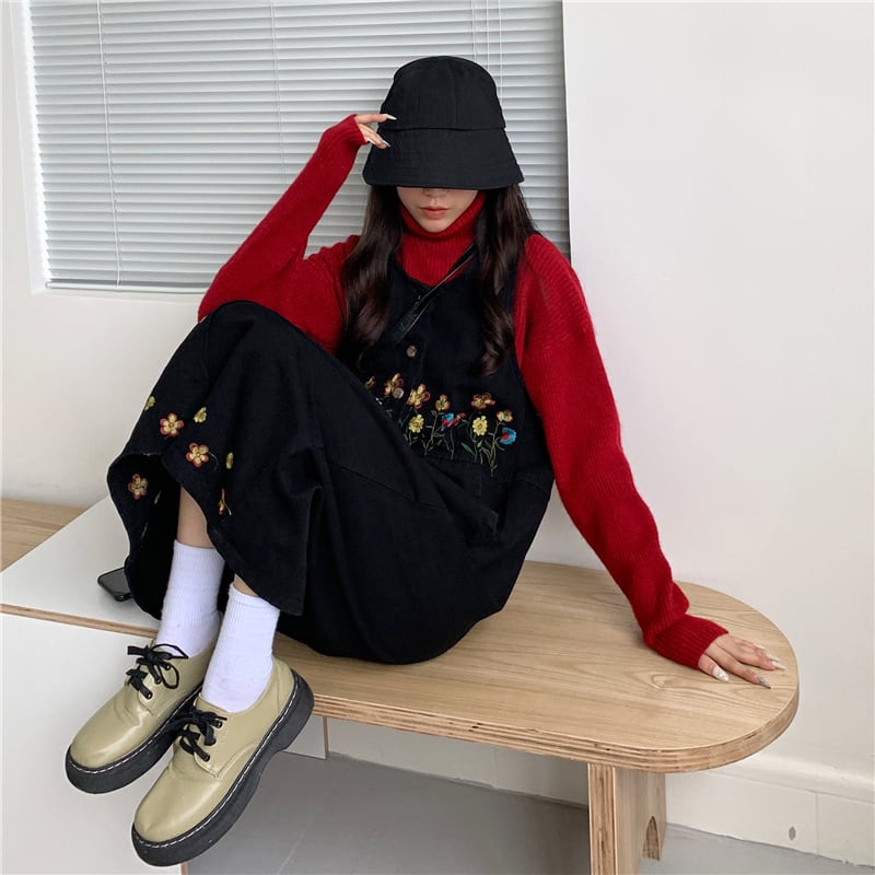 デニムに花の刺繍が散りばめられている、ロング丈のジャンパースカート。