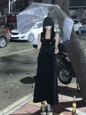 シンプルなブラックデニムで、オールシーズン着ることができるサロペットスカート。