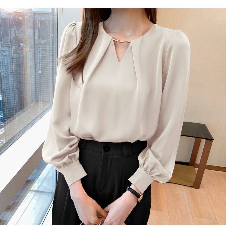 光沢のある生地と立体的なデザインがおしゃれなシフォンブラウス。