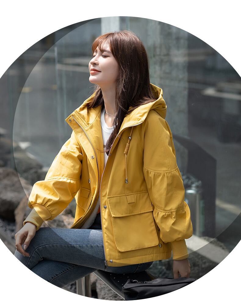 アウトドアなシルエットの中に、切替ギャザースリーブが女性らしさをプラス。