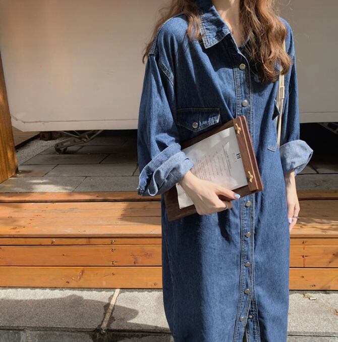 カジュアルなデニムブルーが印象的なロング丈シャツワンピ。