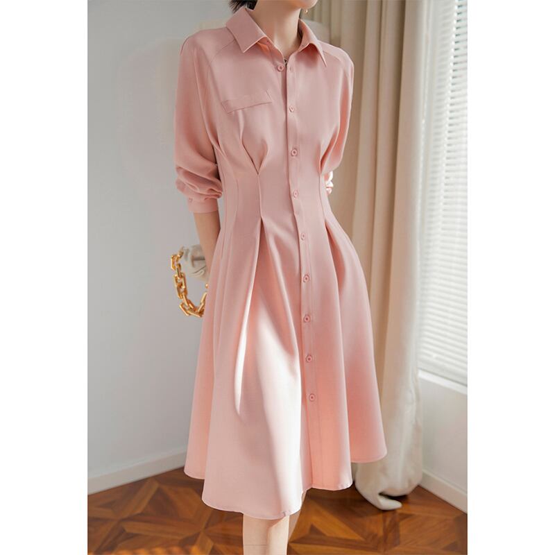シンプルながらも女性らしさ際立つシルエットのシャツワンピ。