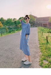 ボーイズライクなボーダー柄が目を惹く、ゆったりシルエットのワンピース。