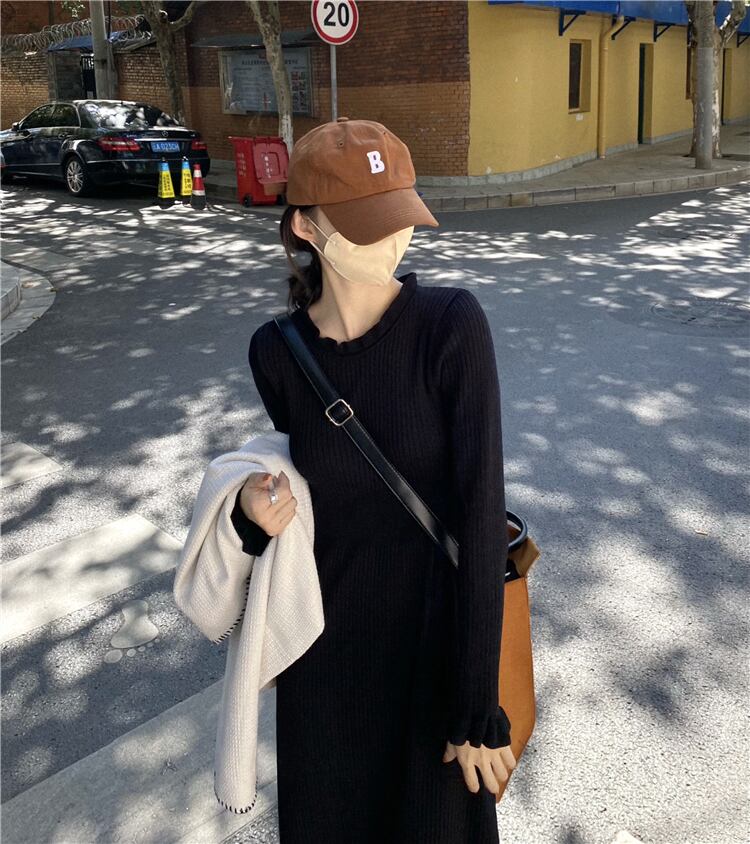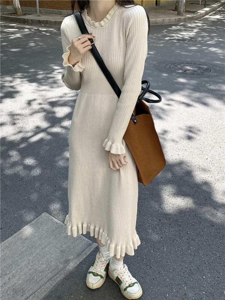 スカート ワンピース ロングスカート ニットスカート ミモレ ミモレ丈 ロング ロング丈 袖あり 長袖 ラウンドネック 襟なし 伸縮性 ニット かわいい きれいめ シンプル カジュアル おしゃれ お洒落 レトロ 大人可愛い 大人女子 ラフ キュート ルーズ 無地 春 秋 10代 20代 30代 レディース 女性用 ママ オフィス ビジネス OL 通勤 学生 通学 デート お出かけ 休日 ショッピング 韓国 韓国系 オルチャン ファッション コーデ スタイル モテ フリーサイズ アプリコット 黒 ブラック | Ritta