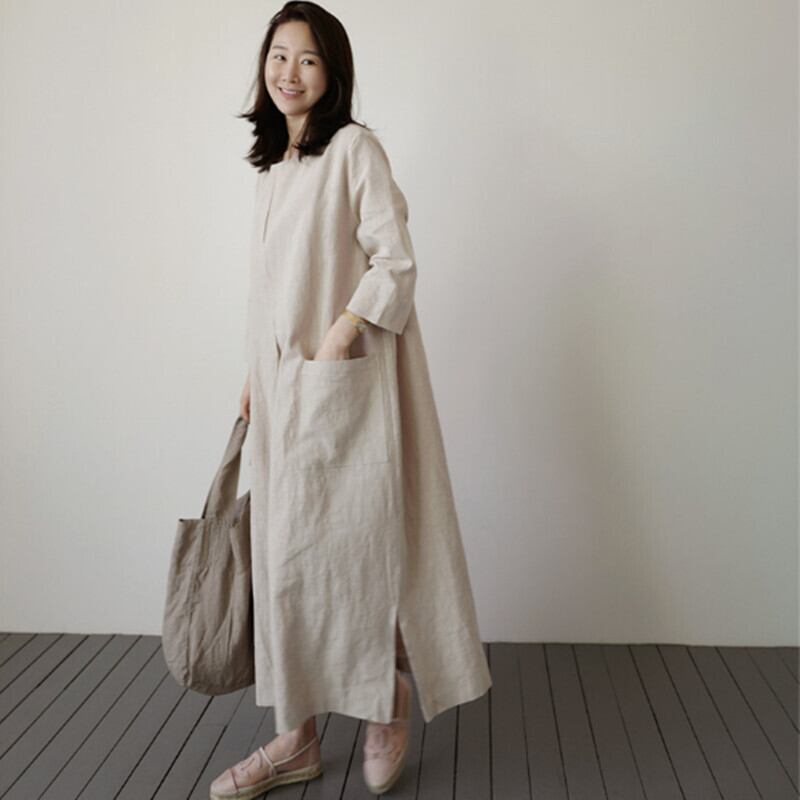ワンピース ロング ロング丈 袖あり 長袖 ラウンドネック 襟なし ノーカラー ワイド スリット サイドスリット ポケット 麻 リネン シンプル カジュアル おしゃれ お洒落 レトロ こなれ感 ラフ ルーズ モード系 抜け感 ベーシック 無地 無地 春 秋 10代 20代 30代 40代 50代 60代 レディース 女性用 ママ マタニティ お出かけ お泊まり 休日 旅行 ショッピング 普段使い ヘビロテ 楽ちん 体型カバー 大きいサイズ 大きい 大きめ ゆったり ゆる くすみカラー 大人カラー | Ritta