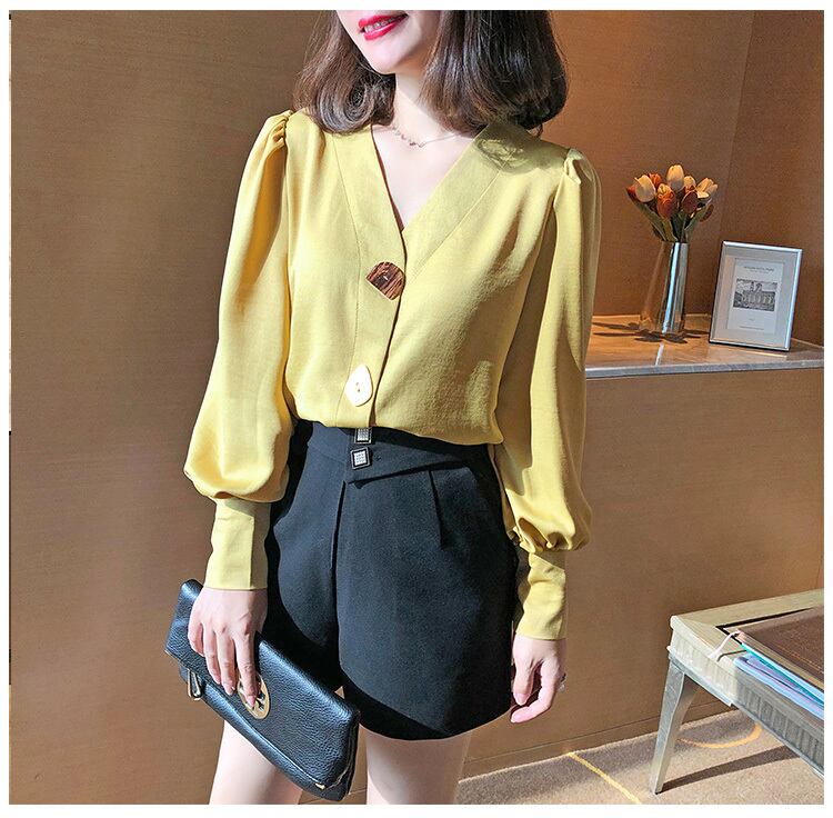 シェルボタンとビショップスリーブが可愛いVネックブラウス。