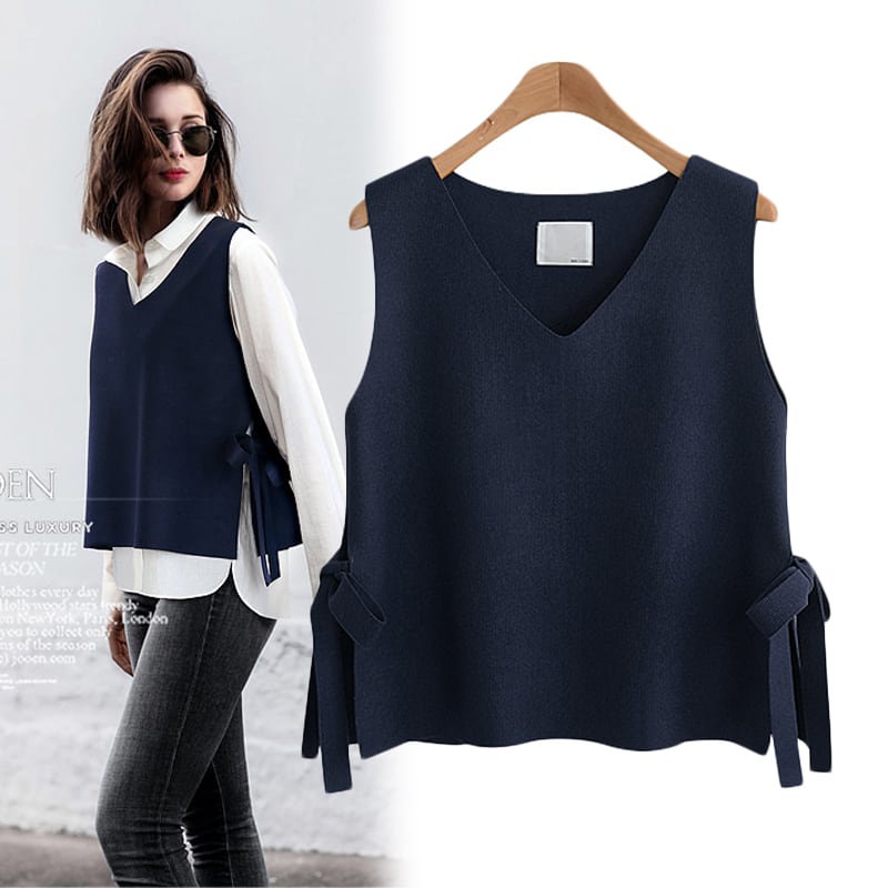 大人女子必見!トレンドのVネックベストが登場。ストレートなシルエットにリボン&サイドスリットでこなれ感UP。ビジネスシーンからリゾートまで着回し力抜群。伸縮性のあるニット素材で着心地も楽ちん。