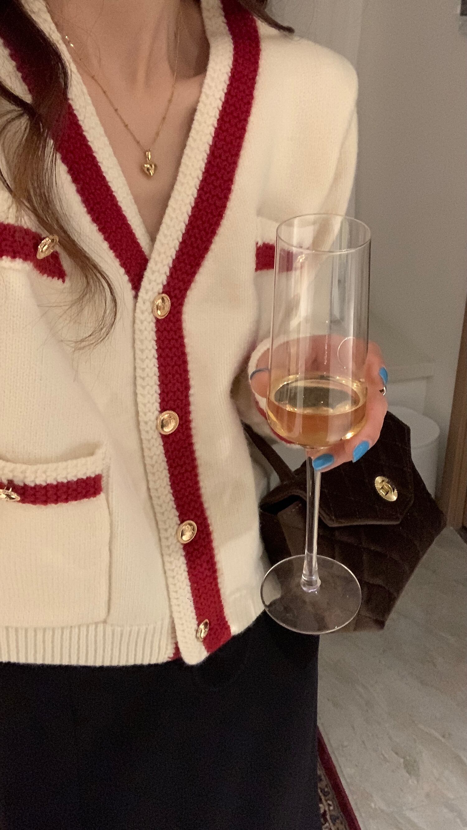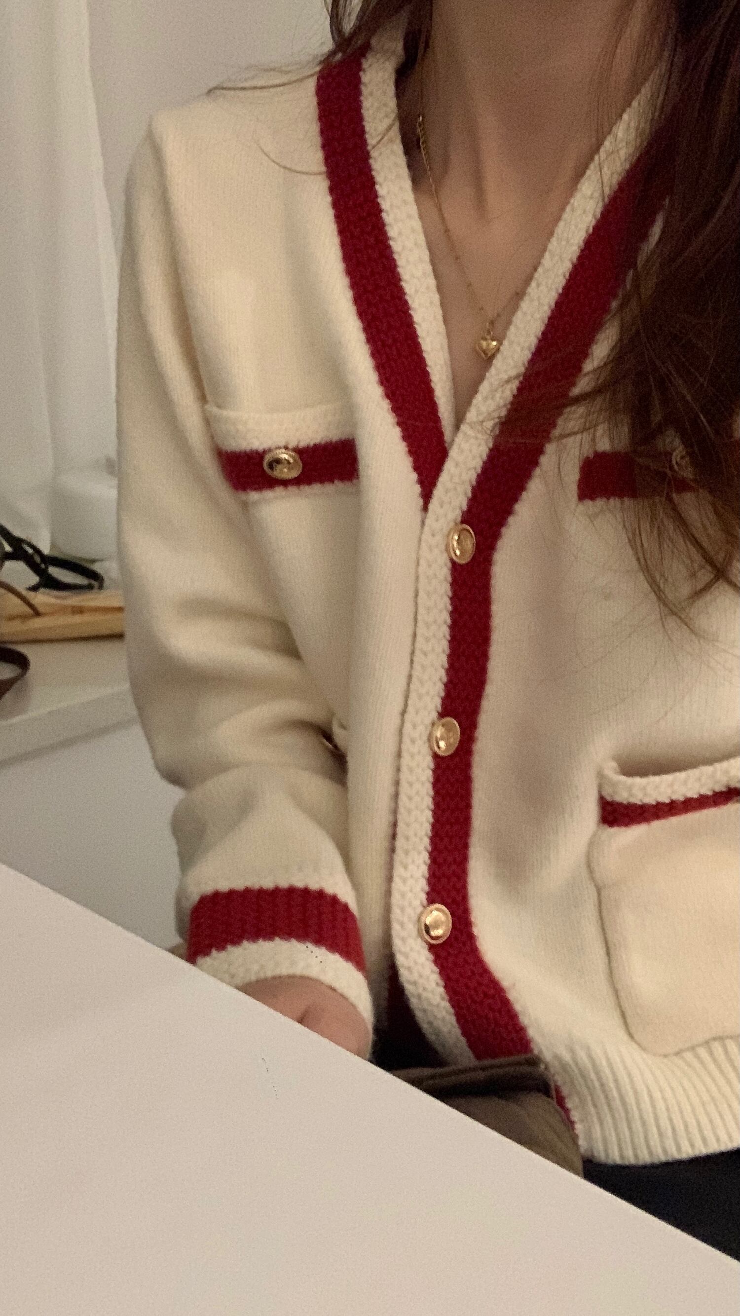 アプリコットの生地に赤のラインとゴールドのボタンがエレガント。
