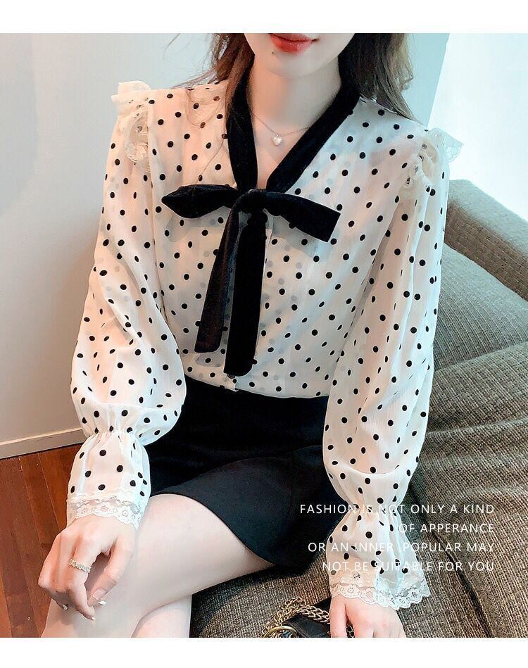 レースと胸元のリボンが可愛いドット柄ブラウス。