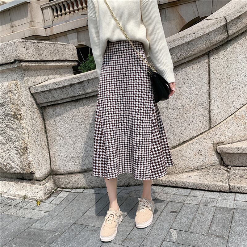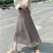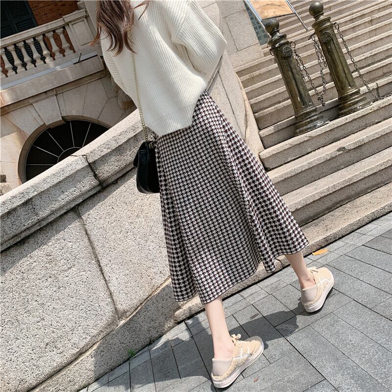 千鳥格子柄ニットスカート ボトムス ロングスカート Aライン ハイウエスト 伸縮性 かわいい 大人可愛い きれいめ シンプル カジュアル 大人 上品 おしゃれ お洒落 レトロ 大人女子 こなれ感 エレガント 存在感 千鳥格子 秋 冬 20代 30代 40代 レディース 女性用 デート お出かけ 休日 着回し 普段使い ファッション コーデ スタイル 楽ちん 体型カバー フリーサイズ 黒 ブラック 茶色 ブラウン フェミニンコーデ カジュアルコーデ きれいめコーデ ミディアム丈 | Ritta