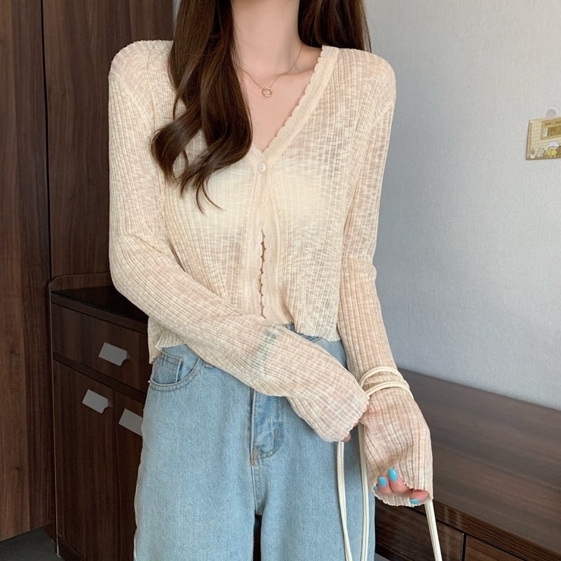 トップス カーディガン 白トップス ショート丈 袖あり 長袖 萌袖 Vネック 襟なし スリム タイト ストレート フリル リブ 前開き 透け感 シースルー 伸縮性 ニット 薄手 かわいい 大人可愛い シンプル カジュアル おしゃれ お洒落 大人女子 こなれ感 ラブリー キュート ガーリー セクシー 抜け感 無地 春 夏 10代 20代 レディース 女性用 キッズ 女の子 学生 通学 デート お出かけ 休日 リゾート 海 プール 着回し 普段使い 重ね着 ファッション コーデ スタイル S M L 白 黒 | Ritta