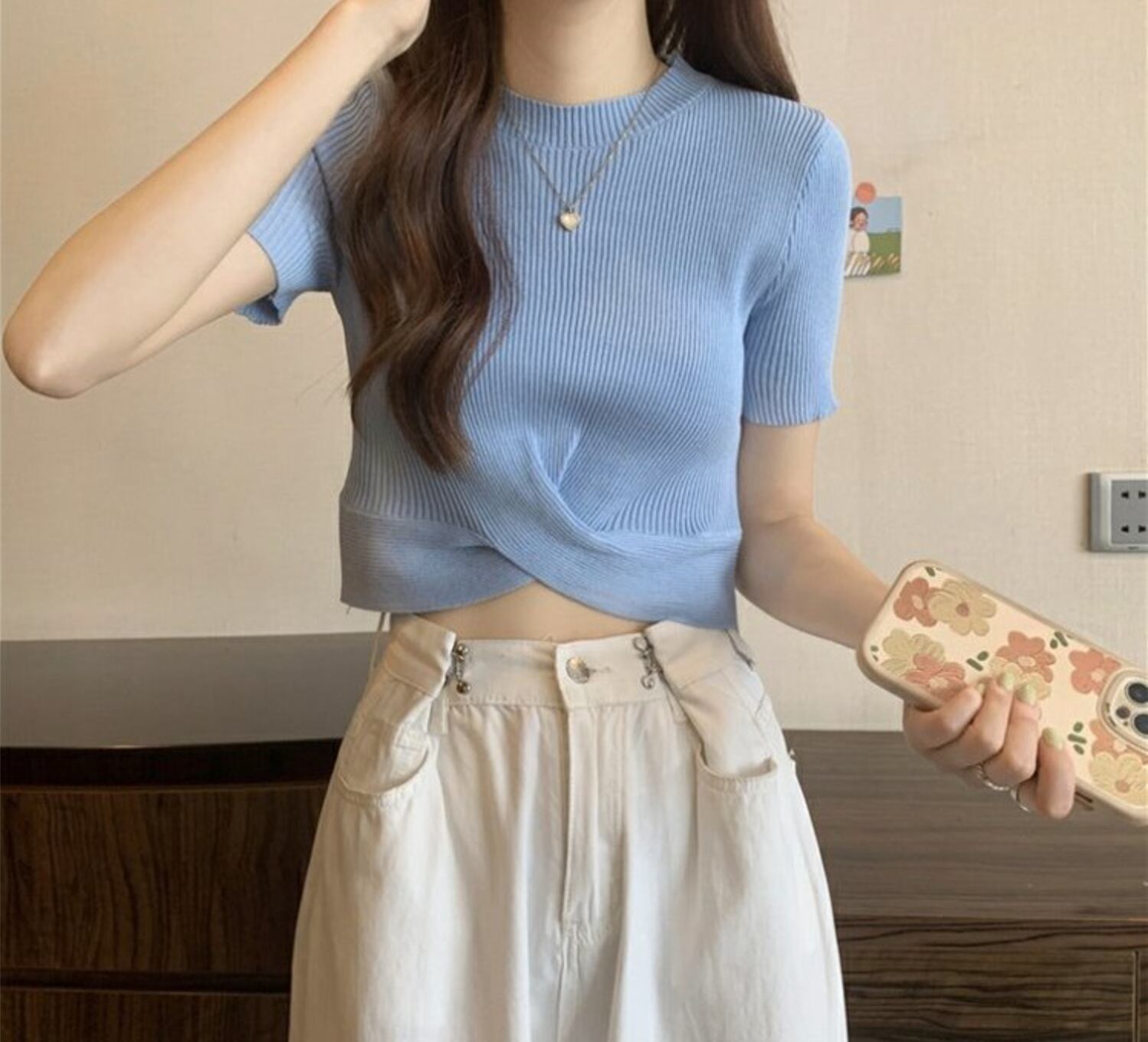 今季のトレンド、ショート丈の半袖ニットが入荷しました!シンプルながらも存在感のある、ラウンドネックのデザイン。一枚で着こなすのはもちろん、重ね着でもおすすめです。袖なしで軽やかな着心地なので、夏のおしゃれにもぴったりです。