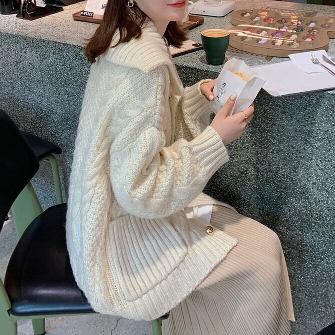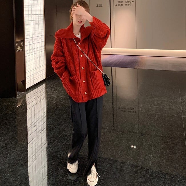 アウター カーディガン 上着 ミディアム丈 袖あり 長袖 ボリューム袖 ドロップショルダー 萌袖 襟付き ストレート ワイド ポケット 前開き ケーブルニット ニット 厚手 かわいい 大人可愛い シンプル カジュアル 上品 おしゃれ お洒落 大人女子 こなれ感 ラフ キュート ルーズ 存在感 無地 春 秋 10代 20代 30代 レディース 女性用 ママ キッズ 女の子 OL 通勤 学生 通学 デート お出かけ 休日 着回し 普段使い 重ね着 体系カバー 定番 S M L XL ゆったり ゆる 赤 灰色 | Ritta