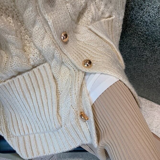 ニット生地は厚手のケーブル編みで、肌寒い日には暖かくフィットします。