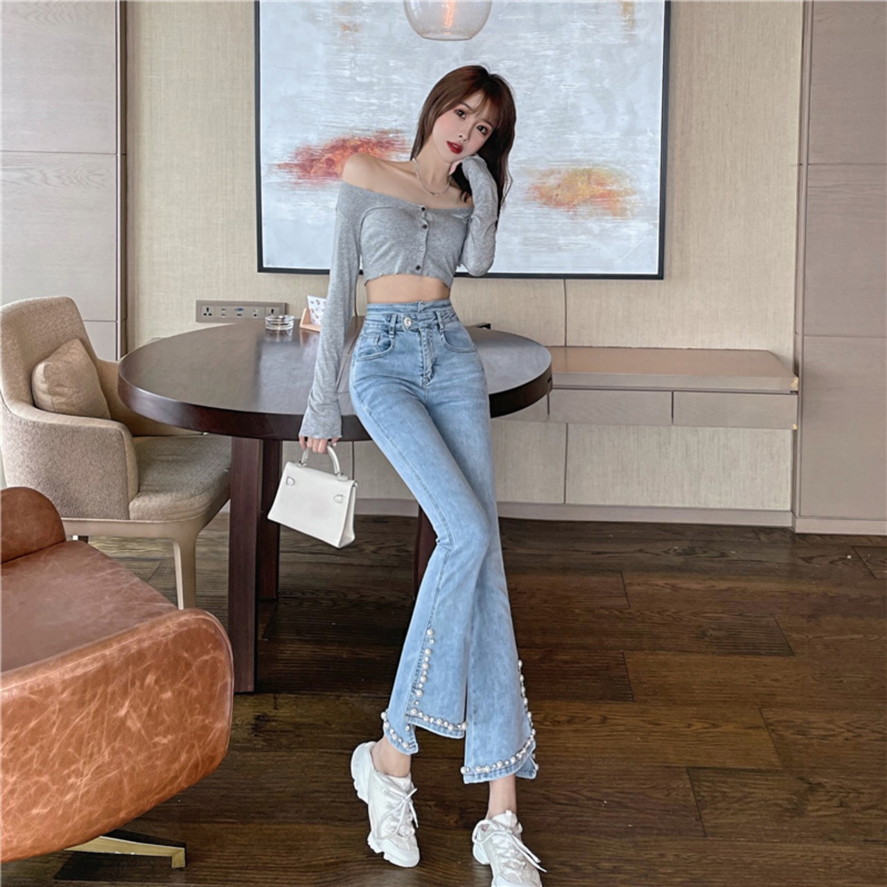 パンツ ズボン Gパン ロング ロング丈 細身 裾フレア ポケット デニム ブルーデニム パール スリット サイドスリット ハイウエスト シンプル カジュアル おしゃれ お洒落 かっこいい レトロ こなれ感 ラフ メンズライク 抜け感 カレッジ風 学生風 アメリカン風 アメリカン風 無地 春 夏 秋 10代 20代 30代 レディース 女性用 ユニセックス 学生 お出かけ 休日 運動 スポーツ アウトドア キャンプ イベント リゾート 海 ショッピング 着回し 普段使い 韓国系 美脚 脚長 トレンド | Ritta
