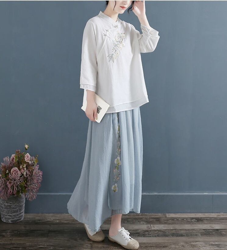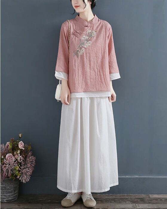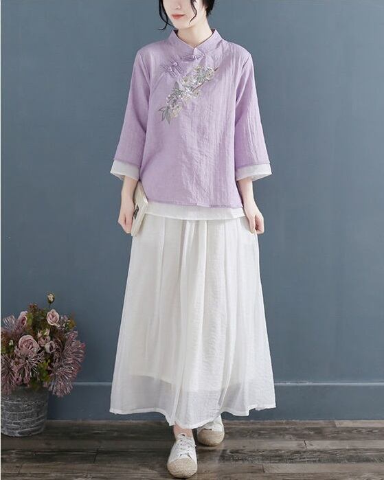 洗練されたデザインで夏のオシャレを引き立てる、大人可愛い7分袖シフォンブラウス。中華風の斜めのカットのデザインや、大胆な刺繍デザインが個性的。リゾートやデートにもぴったりの主役級アイテム。