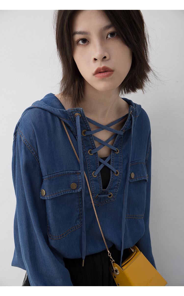 vトップス パーカー チュニック 袖あり 長袖 ドロップショルダー 襟なし ストレート リボン フード付き ポケット デニム 薄手 かわいい 大人可愛い カジュアル 大人 上品 おしゃれ お洒落 かっこいい レトロ 大人女子 こなれ感 ボーイッシュ キュート ルーズ 個性的 クール モード系 モダン 主役級 存在感 抜け感 無地 春 秋 レディース 女性用 OL 学生 お出かけ 女子会 イベント リゾート 旅行 高原 ホテル ガーデン レストラン 着回し 普段使い 重ね着 オルチャン ファッション 楽ちん | Ritta