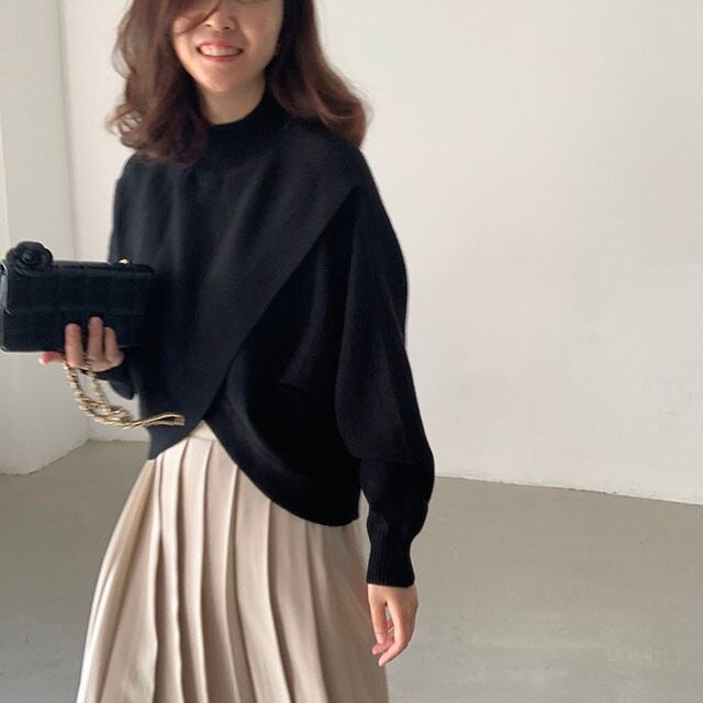 フロントで重なり合う特徴的なデザインが素敵な、ショート丈のセーター。