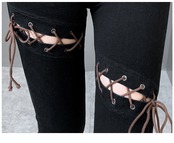 ダメージと穴あきデザインがこなれ感を演出し、編み上げリボンで主役級の存在感があります。