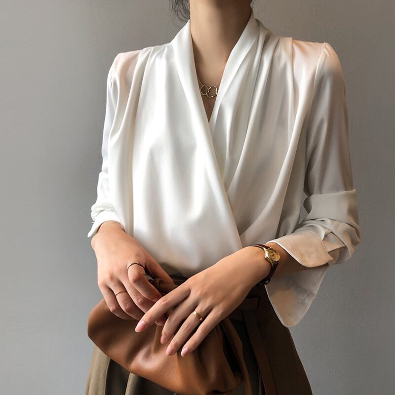 艶のあるサテン地のドレープが上品で美しい印象を与えてくれるVネックラインのシャツ。