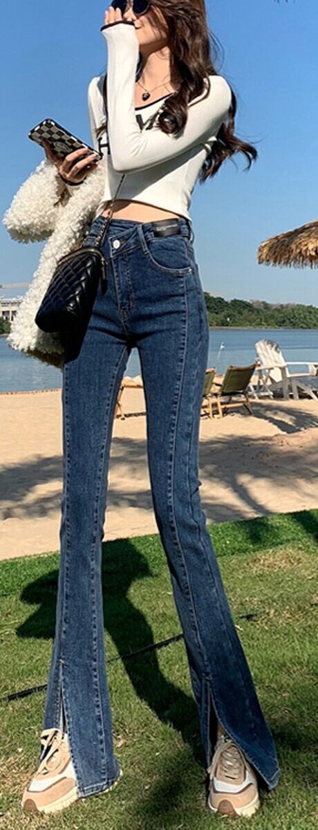 裾のスリットがポイントで、脚長効果が期待できる、シンプルながらもこだわったジーンズ。