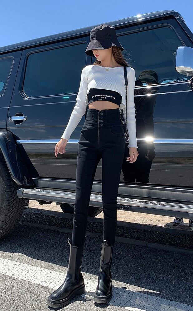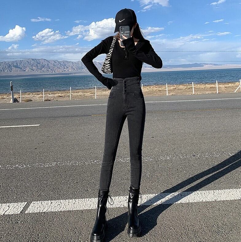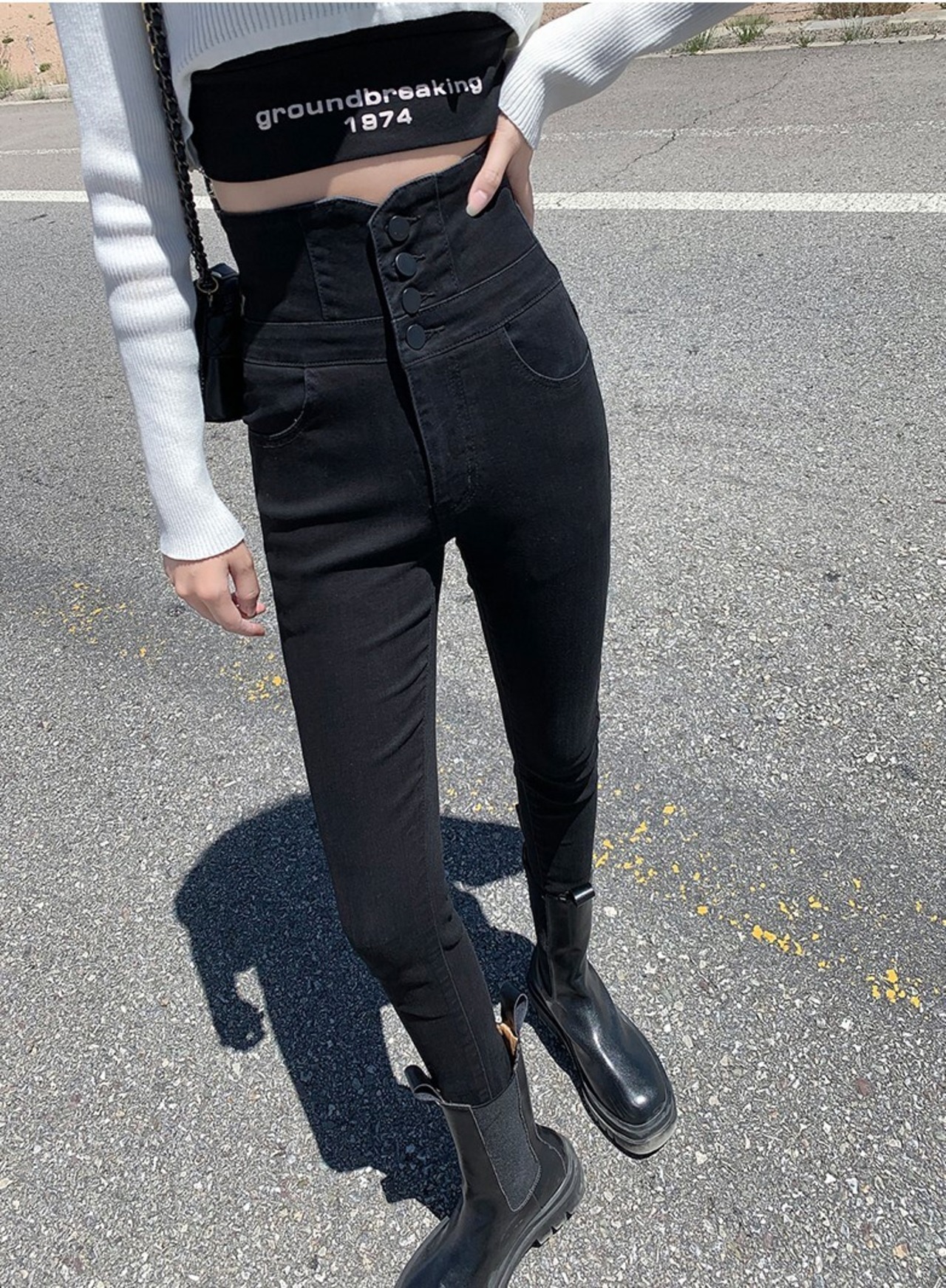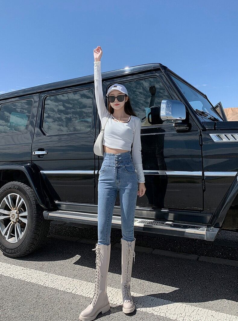 このハイウエストデニムは、フロントのボタンが目を引くデザインがポイント。