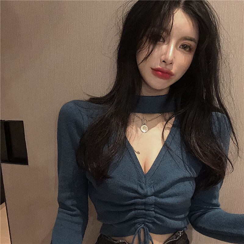 大人女子にふさわしい、こなれ感溢れるショート丈ニット。Vネックと首に巻くリボンがセクシーで個性的な魅力を引き立てます。秋冬の主役級アイテムで、OLや学生、デートやイベントにもぴったり。おしゃれな存在感と抜け感を演出する、モダンでスタイリッシュな一枚。