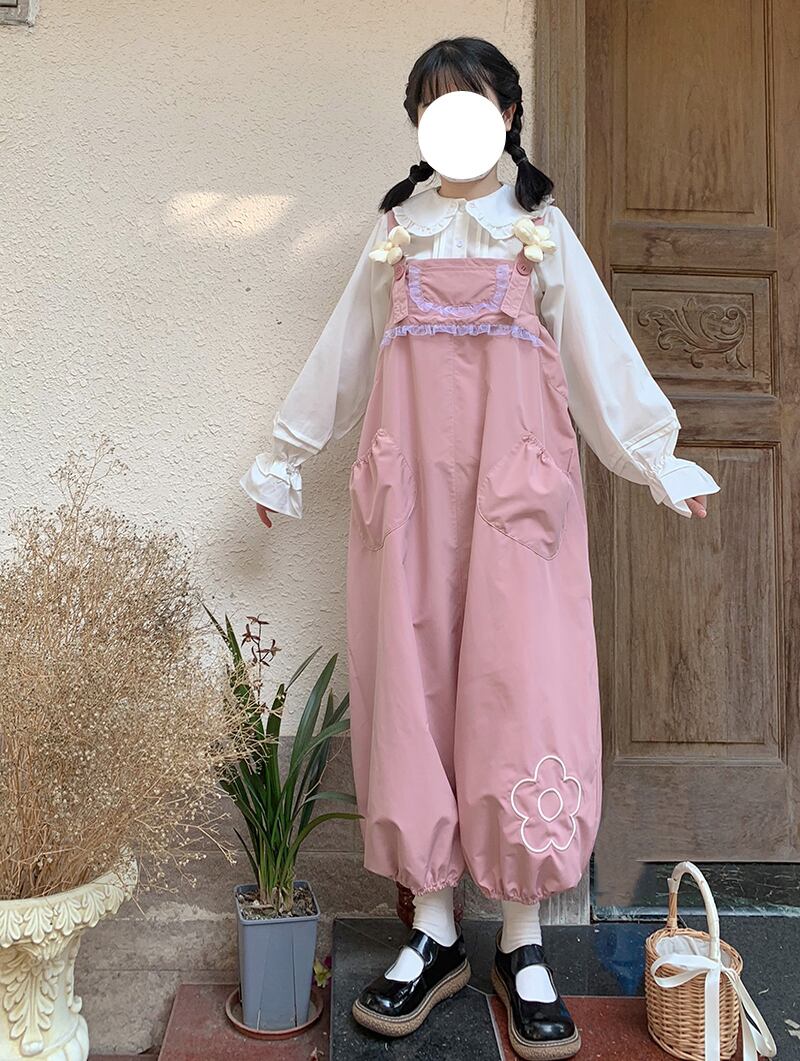 胸元のフリルや足元のお花のデザインがカワイイサロペット。