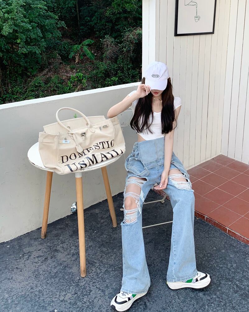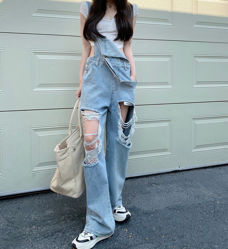 ダメージデザインが個性的な、サロペットデニムパンツ。