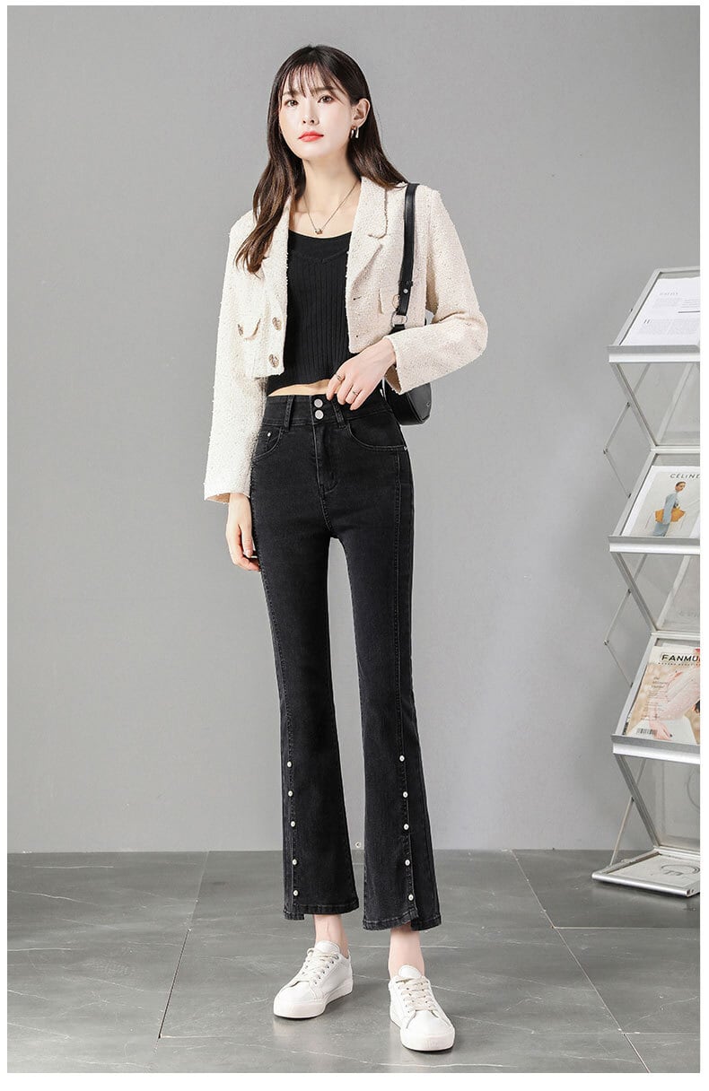 裾パール九分丈フレアデニムパンツ ボトムス 9分丈 スリム タイト 細身 ポケット ハイウエスト 伸縮性 ブルーデニム かわいい 大人可愛い きれいめ シンプル カジュアル 大人 上品 おしゃれ お洒落 大人女子 こなれ感 ラフ 個性的 無地 春 夏 10代 20代 30代 40代 レディース 女性用 デート お出かけ 休日 旅行 着回し 普段使い ファッション コーデ スタイル 美脚 脚長 黒 ブラック 青 ブルー カジュアルコーデ フェミニンコーデ きれいめコーデ スリット | Ritta