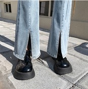 スリット入りの裾が女性らしい雰囲気を演出し、スリムなシルエットで脚長効果もあります。