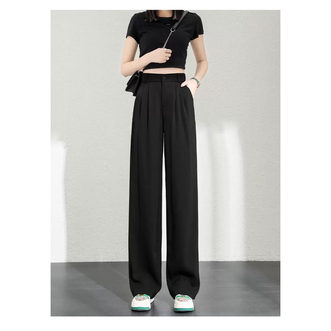 ハイウエストで、脚長美脚効果抜群なワイドパンツ