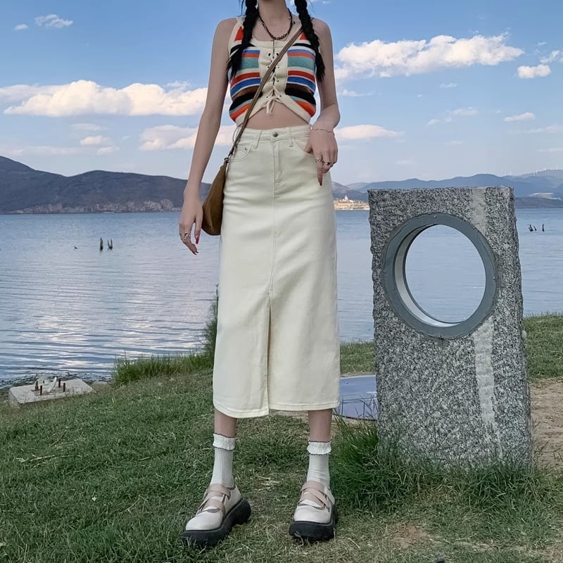 スカート ボトムス ミドルスカート デニムスカート デニム ミドル ミドル丈 膝下 スリット Iライン タイト ストレート ハイウエスト かわいい 大人可愛い シンプル カジュアル 大人 おしゃれ お洒落 セクシー レトロ アジアン オトナ可愛い 大人女子 こなれ感 ラフ ガーリー ルーズ 個性的 無地 春 夏 秋 10代 20代 30代 レディース 女性用 ママ デート お出かけ 女子会 休日 アウトドア リゾート 旅行 海 プール ショッピング 普段使い 韓国系 ファッション コーデ アイボリー 白 | Ritta