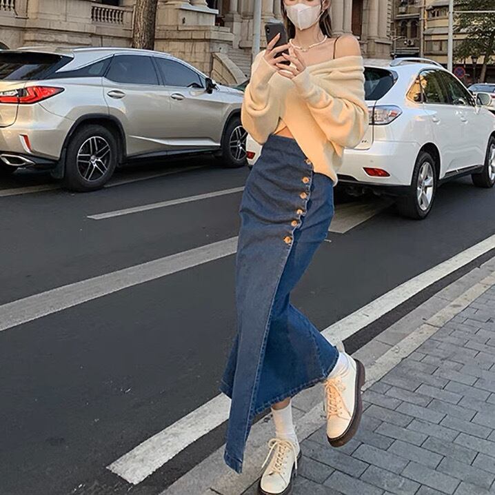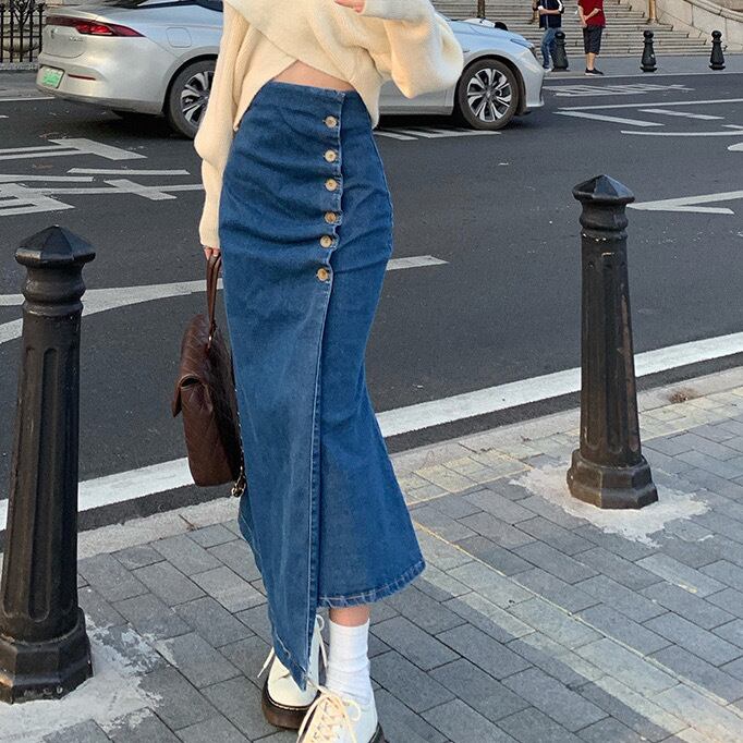 マーメイド デニム ロングスカートスカート ボトムス 膝下 ロング ロング丈 スリム 細身 フィッシュテール スリット ハイウエスト ボタン デニム ブルーデニム 大人可愛い きれいめ シンプル カジュアル おしゃれ お洒落 レトロ オトナ可愛い 大人女子 こなれ感 無地 春 夏 秋 冬 オールシーズン シーズンレス 10代 20代 30代 レディース 女性用 デート お出かけ 女子会 休日 ショッピング 着回し 普段使い 韓国 韓国系 ファッション コーデ スタイル モテ 美脚 脚長 サイズ S M L | Ritta