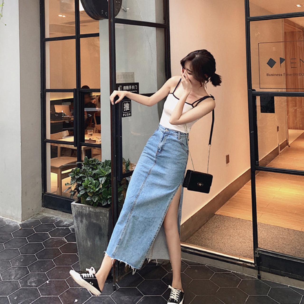 サイドスリットの入った、デニムロングスカート