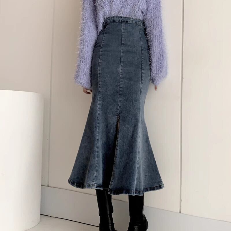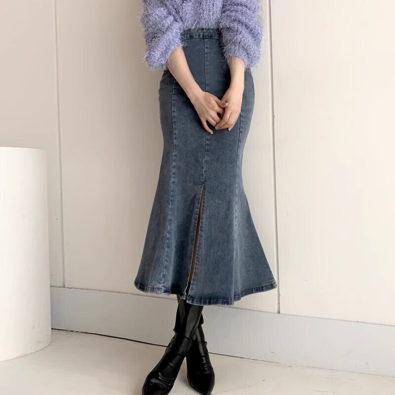デニム フリル フレア 前スリット デニム ボトムス スカート ミドル丈 ハイウエスト 体型カバー ストレッチ Aライン ゆったり 無地 大人カジュアル きれいめ カジュアル おしゃれ 可愛い おしゃれ かっこいい レトロ アジアン 春 秋 10代 20代 30代 レディース お出かけ 休日 着回し 普段使い 韓国 韓国系 オルチャン ファッション コーデ スタイル インスタ映え S M L ブラック ブルー | Ritta